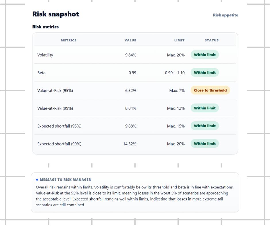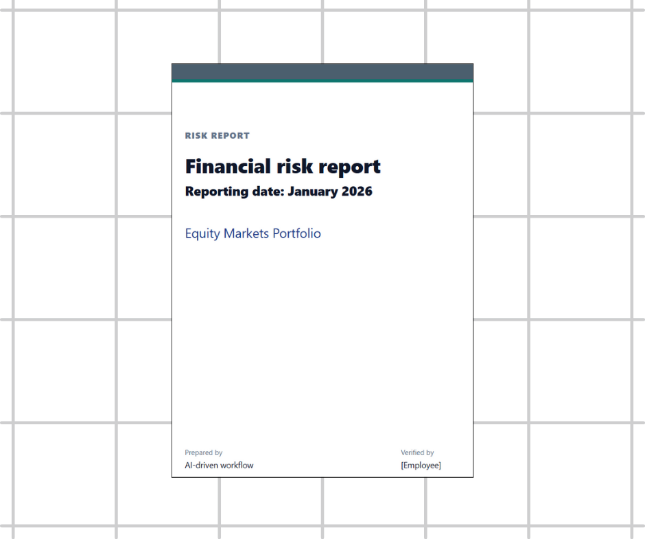 The workflow continuously analyses portfolio data to identify, measure and monitor risk. Risk teams receive clear views for oversight and internal reporting, so they can focus on understanding exposures and acting on risks rather than assembling analyses.