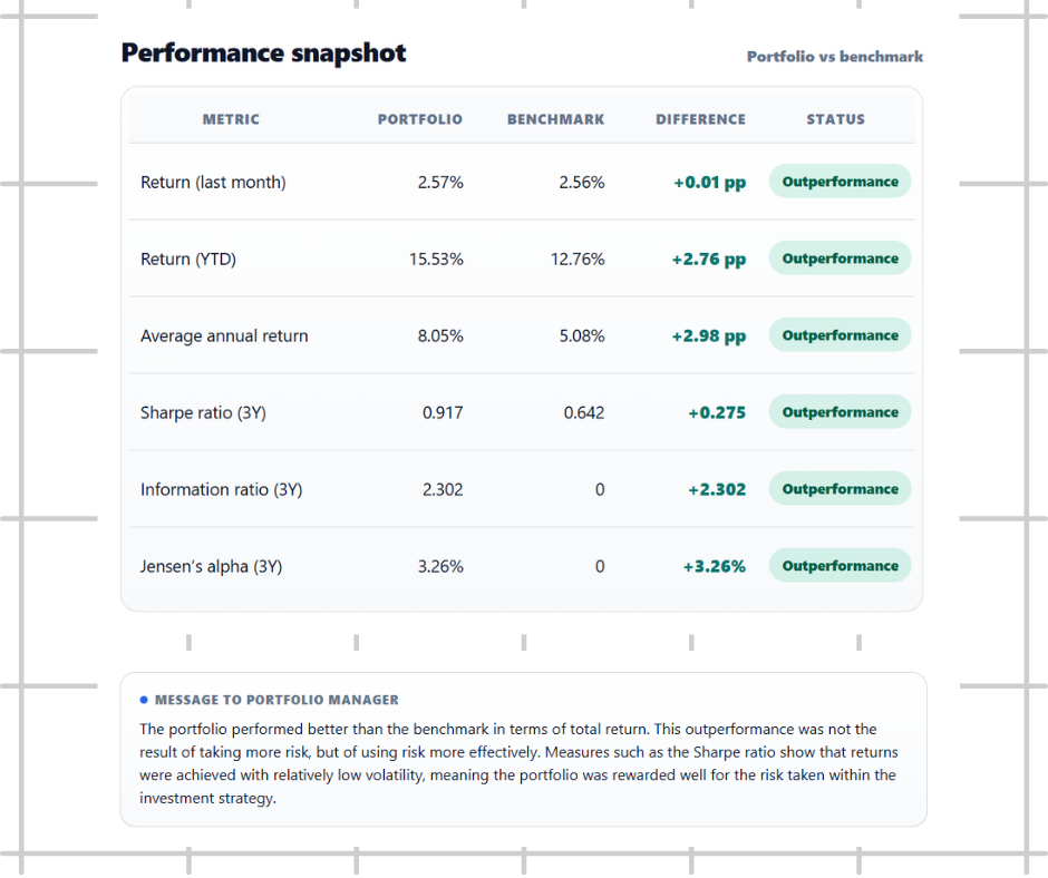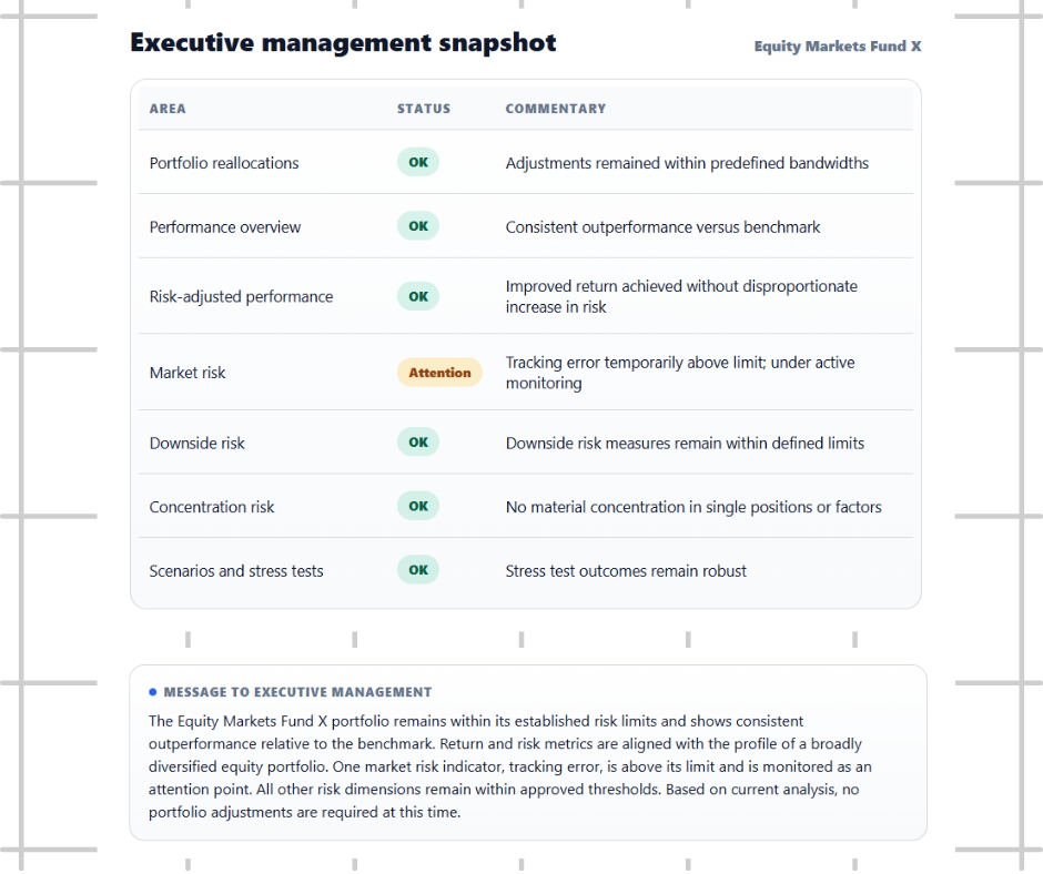 Provides clear summaries of key developments across portfolios, performance and risk to support effective oversight.
