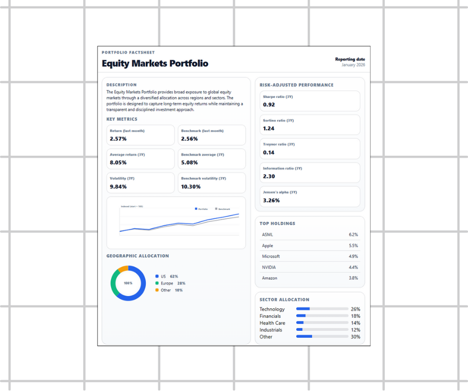 Delivers client-facing reports that are aligned with portfolio, risk and management views, ensuring one consistent story and trusted numbers.